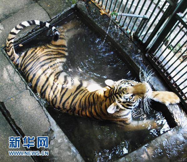 8月4日,九江動物園內(nèi)一只東北虎在水池中降溫。當日,江西省九江市最高氣溫達39℃,局部縣鄉(xiāng)超40℃。九江動物園的工作人員采取喂西瓜、放冰塊及淋浴的辦法,幫助動物避暑降溫,安全度夏。新華社發(fā)(胡國林 攝)