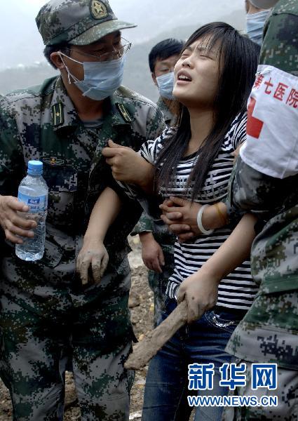 8月13日,醫(yī)務(wù)人員在勸說劉春花離開災(zāi)難現(xiàn)場(chǎng)。 “弟弟,明天我陪你去報(bào)名!”面色蒼白的劉春花一邊大聲地呼喊,一邊瘋狂地用雙手刨挖泥土,8月14號(hào)本是她在舟曲一中讀高二的弟弟軍訓(xùn)報(bào)名的日子,然而此刻,她的雙親和弟妹卻都被埋在了深深的淤泥里。幾天前,得知自己的家鄉(xiāng)甘肅舟曲發(fā)生泥石流災(zāi)害,在深圳打工的劉春花由火車轉(zhuǎn)乘汽車匆忙趕往家鄉(xiāng)。8月12日夜里,三天三夜沒有進(jìn)食的劉春花終于回到舟曲縣城。早上天一亮,心急如焚的劉春花就趕到自家的位置,才發(fā)現(xiàn)這里只有厚厚的淤泥,而她還懷揣自己打工掙的錢,想給弟弟妹妹買電腦。由于難以接受再也見不到親人的現(xiàn)實(shí),劉春花用自己的雙手瘋狂地刨挖著冰冷的泥土,前來勸阻她的姑姑和表妹幾次被劉春花推倒在地,三個(gè)小時(shí)后,她終因體力不支被醫(yī)護(hù)人員抬回醫(yī)療救助點(diǎn)。新華社發(fā)(劉瀟 攝)