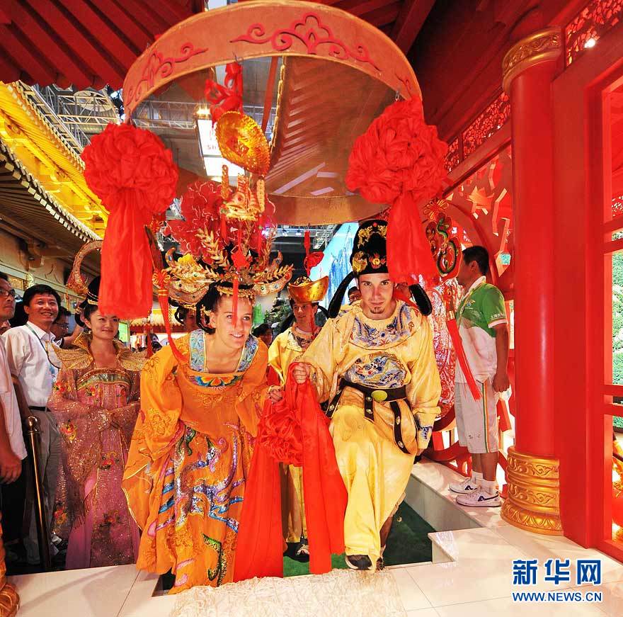 8月14日,在上海世博會陜西館,外國游客在體驗(yàn)“大唐婚典”。當(dāng)日,上海世博會陜西館為迎接我國傳統(tǒng)節(jié)日“七夕節(jié)”而舉辦的“華清池中華情人節(jié)系列活動”開幕。兩對外國游客現(xiàn)場體驗(yàn)了“大唐婚典”,感受中國情人節(jié)的浪漫。新華社記者 丁海濤攝