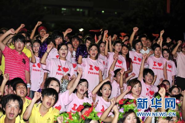 當日,一場由2萬名員工參加的誓師大會在富士康深圳龍華廠區(qū)舉行,其主題是“珍愛生命、關(guān)愛家人”。富士康希望借此提升員工的凝聚力和向心力,鼓勵更多人珍惜生命! 〈舜位顒佑筛皇靠倒M織,以深圳龍華廠區(qū)為主會場,其他各外廠區(qū)同步視頻連線展開,富士康直接參與的員工超過5萬人;顒臃譃椤翱鞓芳文耆A”“愛心傳遞”“平安誓言”“美好未來”四個部分。新華社記者 陳曄華 攝
