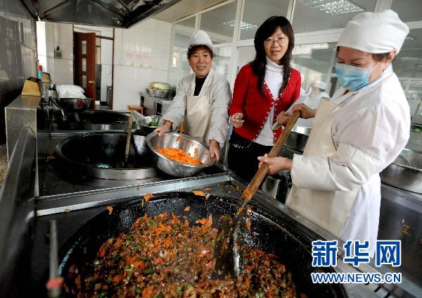 遼寧省沈陽市岸英小學(xué)的公共營養(yǎng)師張宇(中)正在學(xué)校食堂指導(dǎo)廚師炒菜(2009年11月4日攝)。校園公共營養(yǎng)師運用營養(yǎng)學(xué)的知識和方法,通過計算學(xué)生對各種營養(yǎng)素的需求量,制定合理的營養(yǎng)食譜,促進(jìn)兒童和青少年健康成長。新華社發(fā)(張文魁攝)