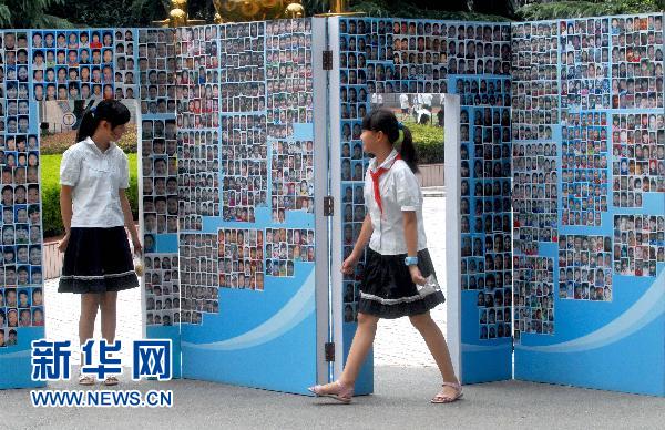 9月1日,武漢市育才小學(xué)兩名學(xué)生在“跨越門”上尋找自已的笑臉。新學(xué)期開學(xué)的第一天,武漢市育才小學(xué)在校園里設(shè)立一處“跨越門”,將該校3000多名學(xué)生的笑臉照片貼在上面,讓新生們感受新校園新氣象。新華社發(fā)