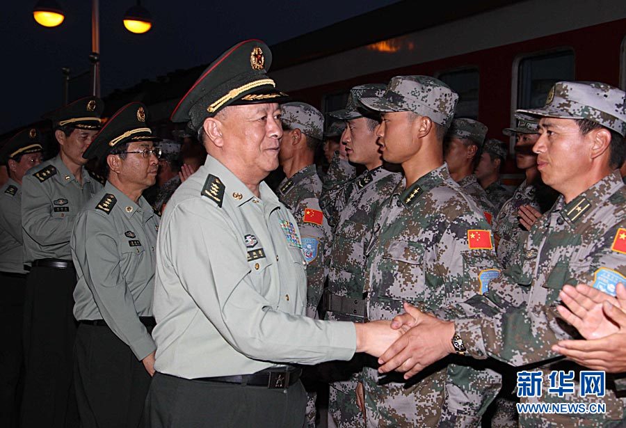 9月2日,中央軍委委員、總參謀長(zhǎng)陳炳德出席出發(fā)儀式,為參演官兵送行。當(dāng)日,“和平使命-2010”上海合作組織成員國武裝力量聯(lián)合反恐軍事演習(xí)中方參演部隊(duì)出發(fā)儀式在北京軍區(qū)朱日和合同戰(zhàn)術(shù)訓(xùn)練基地舉行。中方第五、第六批通過鐵路輸送的參演官兵,從朱日和火車站啟程前往哈薩克斯坦境內(nèi)演習(xí)地域。新華社記者王建民攝