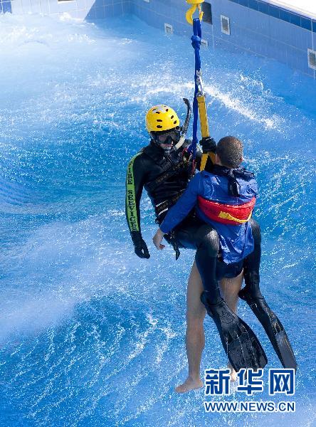 9月15日,香港消防處潛水組成員在展示水上直升機絞盤救助。當日,香港消防處潛水組在香港昂船洲潛水基地展示水中救援。香港消防處潛水組成立于1992年,主要負責香港海面及各類水底搜救行動。目前編制約為150人。新華社記者陳鐸攝