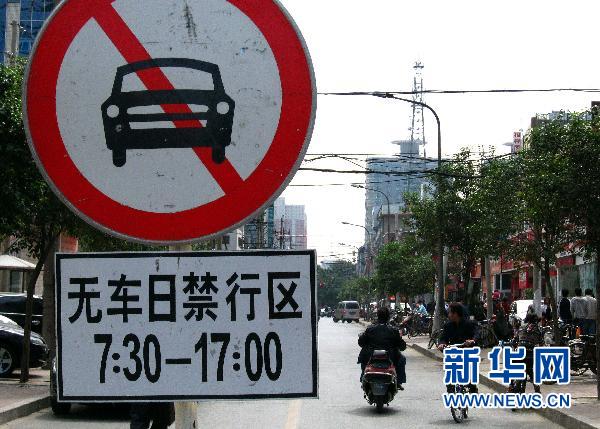 9月22日,鄭州市區(qū)的一個路口擺放著“無車日禁行區(qū)”的標志牌。