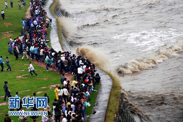 9月23日,游客在觀看錢(qián)塘江潮。當(dāng)日是秋分節(jié)氣,又值中秋假日,眾多游客來(lái)到浙江海寧市鹽官觀潮景區(qū)觀看錢(qián)塘江潮。錢(qián)塘江大潮號(hào)稱“天下第一潮”,中秋前后是觀看錢(qián)塘江潮的最佳時(shí)機(jī),每年都會(huì)吸引數(shù)十萬(wàn)中外游客前來(lái)觀看。 新華社記者 韓傳號(hào) 攝