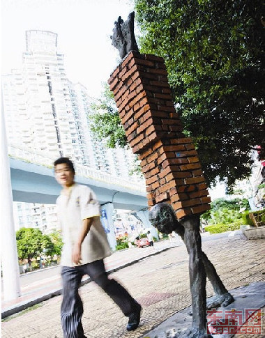 這一雕塑位于城市鬧區(qū),四周高樓林立,交通繁忙,加上磚塊、負(fù)重等感官因素,確實(shí)容易令一部分人將其與房奴二字聯(lián)系起來,因此,被網(wǎng)友形象地稱為“房奴雕塑”。