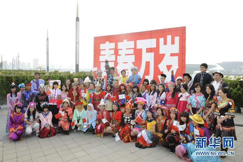 10月1日,在世博園浦西船塢廣場(chǎng),56個(gè)民族代表在參加升國(guó)旗儀式前合影。