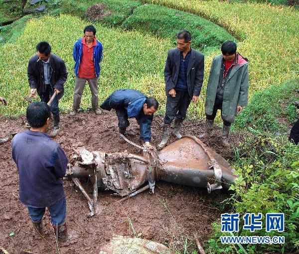 10月2日,當(dāng)?shù)厝藴?zhǔn)備搬運(yùn)墜落的火箭一級(jí)殘骸。 10月1日,“嫦娥二號(hào)”衛(wèi)星在西昌衛(wèi)星發(fā)射中心成功升空后,搭載衛(wèi)星的“長(zhǎng)征三號(hào)丙”運(yùn)載火箭一級(jí)殘骸落墜在貴州鎮(zhèn)遠(yuǎn)縣境,目前回收工作正在進(jìn)行中。新華社發(fā)(吳如雄 攝)