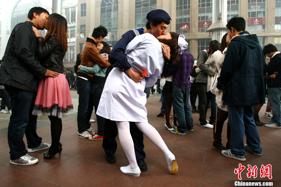 2010年10月10日10點10分,為迎接十全十美時分的到來,百對情侶齊聚北京世貿(mào)天階廣場相擁熱吻,一場新潮的集體KISS活動引爆了“雙十”佳期的幸福潮流。圖為一對情侶再現(xiàn)了1945年紐約慶祝二戰(zhàn)勝利的經(jīng)典畫面--勝利之吻。 中新社記者 富田 攝