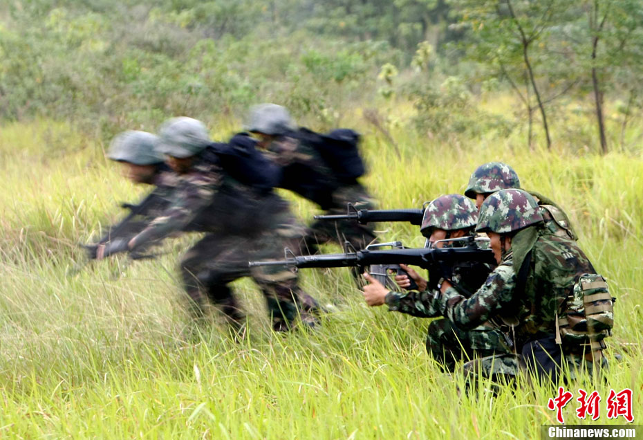 10月11日,中國、泰國兩軍特種部隊“突擊—2010”反恐聯(lián)合訓(xùn)練在廣西桂林開展混合班組掩護(hù)實彈射擊訓(xùn)練。此次聯(lián)訓(xùn)為期15天,這是中泰兩國陸軍首次就城市反恐課題開展聯(lián)訓(xùn)。中新社發(fā) 杜洋 攝