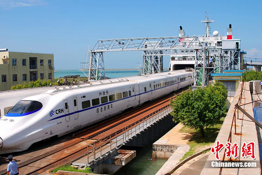 2010年10月14日,一列由內(nèi)燃機(jī)車頭牽引的CRH2-010A鐵路檢測專用動(dòng)車組,從粵海鐵路南港碼頭緩緩駛下船,向?诨疖囌鹃_去,標(biāo)志著我國“和諧號”動(dòng)車組首次成功登上海南島。 實(shí)錄 攝