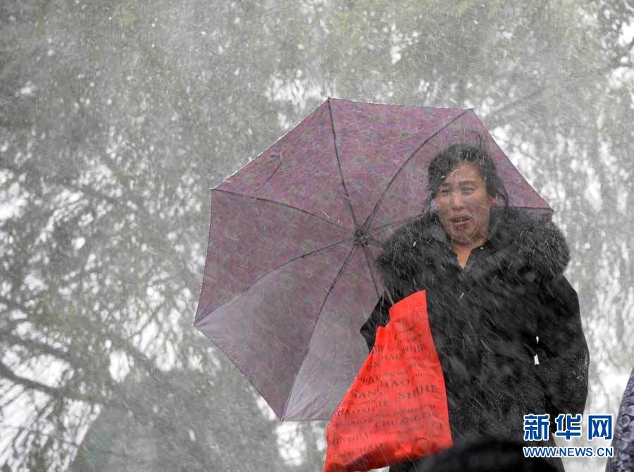 10月16日,黑龍江省七臺河市降雪,市民打著傘冒雪出行。