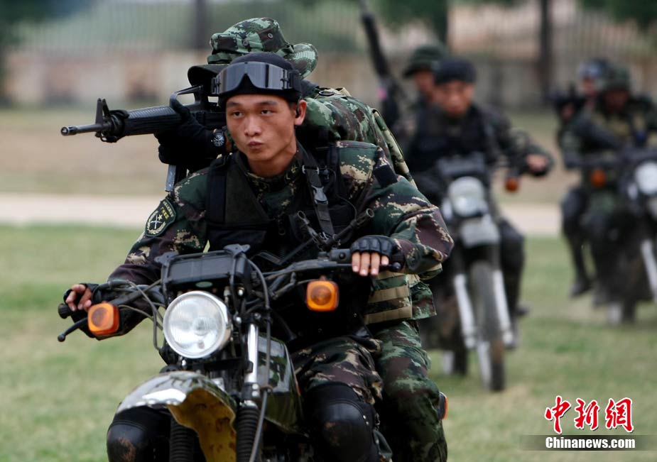 10月19日,“突擊-2010”中泰反恐聯(lián)訓(xùn)在廣州軍區(qū)“紅嶺”合同戰(zhàn)術(shù)訓(xùn)練基地舉行“獵鼬”行動實(shí)兵綜合演練,圍繞“城市聯(lián)合反恐行動”這一課題,演練了快速封鎖、偵搜排查、隔離疏散、立體突擊4個行動。演練模擬一名為“臭鼬”的國際恐怖組織在泰國制造暴力恐怖活動后,秘密潛入中國G市紅嶺小區(qū),企圖在XX地區(qū)領(lǐng)導(dǎo)人峰會期間繼續(xù)制造恐怖事件,干擾峰會順利進(jìn)行。中泰兩國政府依據(jù)聯(lián)合反恐協(xié)議,決定成立聯(lián)合指揮機(jī)構(gòu),抽調(diào)特種部隊(duì)精銳力量組成“獵鼬突擊隊(duì)”,共同進(jìn)行反恐作戰(zhàn)任務(wù)。 中新社記者 杜洋 攝