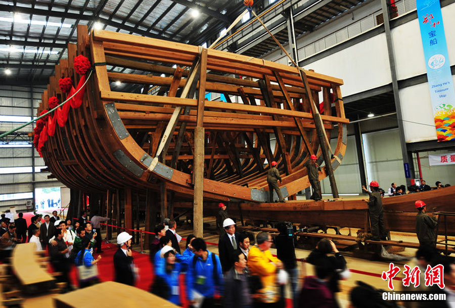 10月20日,南京,作為“2010年南京名城會”的序曲,“鄭和寶船復(fù)建慶典”在鄭和寶船廠舉行,主體已經(jīng)完工1/3的“鄭和寶船”露出“廬山真面目”。這座鄭和寶船將在明年9月船體竣工,2013年將沿著鄭和當(dāng)年的航海路線“環(huán)球航行”。圖為復(fù)建的寶船進(jìn)行了肋骨安放儀式。邵丹 攝