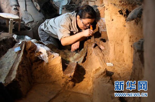 秦兵馬俑博物館的考古人員正在考古現(xiàn)場進(jìn)行發(fā)掘(2009年8月攝)。