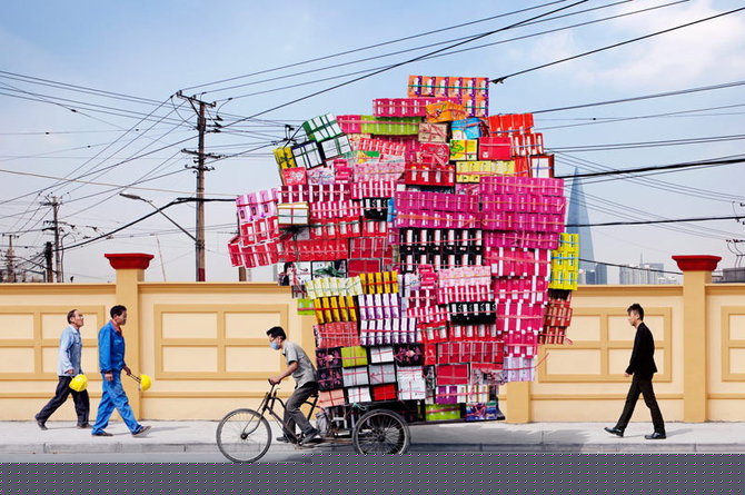 這組震撼的圖片是Alain Delorme在上海拍攝的作品,名為“圖騰”。Alain的鏡頭聚焦的是終日乾乾的個(gè)體勞動(dòng)者,從中國(guó)各地來(lái)到上海的農(nóng)民工。他們的身影在身后堆疊的“中國(guó)制造”的映襯下顯得格外渺;他們的倒影卻在烈日中顯得格外厚重。