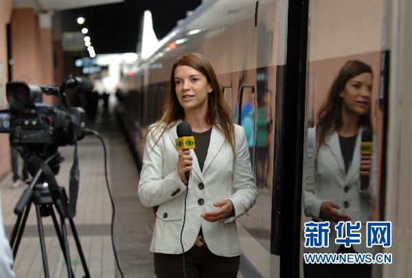 10月26日,滬杭高鐵開(kāi)通吸引大批國(guó)內(nèi)外媒體采訪,這是巴西國(guó)家電視臺(tái)的記者在滬杭高鐵列車旁出鏡。當(dāng)日,由上海發(fā)往杭州的首班G5001次國(guó)產(chǎn)“和諧號(hào)”CRH380A高速動(dòng)車組列車到達(dá)杭州火車站。連接上海、杭州兩個(gè)城市的滬杭高鐵正式開(kāi)通。新華社記者 黃宗治 攝