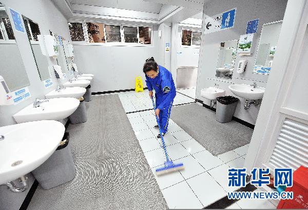 世博之美,美在大氣磅礴,亦美在細(xì)致入微;人們沉醉世博,難舍世博,難忘世博,不僅因?yàn)檫@里集人類文化與科技精華之大成,也因?yàn)檫@里匯聚了無數(shù)充滿溫情與智慧的細(xì)節(jié)。這是人類歷史上壯麗的一幅卷軸,也是一張我們從未有過的考卷,讓我們銘記:細(xì)節(jié)記錄精彩,細(xì)節(jié)疊加滿意,細(xì)節(jié)決定成敗。保潔員朱定碧在清掃世博園里的廁所(5月21日攝)。 新華社記者何俊昌攝