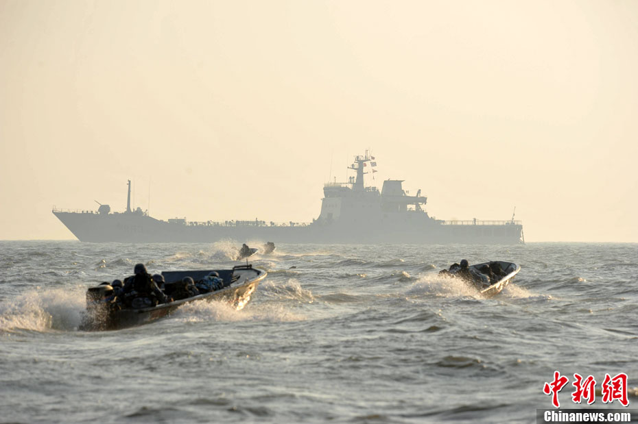 11月2日,海軍陸戰(zhàn)隊(duì)兩棲突擊登陸戰(zhàn)斗在南海某海域打響,就此拉開了代號為“蛟龍—2010”的實(shí)兵實(shí)彈檢驗(yàn)性演習(xí)序幕。圖為“蛟龍—2010”演習(xí)海軍陸戰(zhàn)隊(duì)開乘快艇向登陸艦駛?cè)ラ_始浮渡裝載。中新社發(fā) 陶社蘭 攝