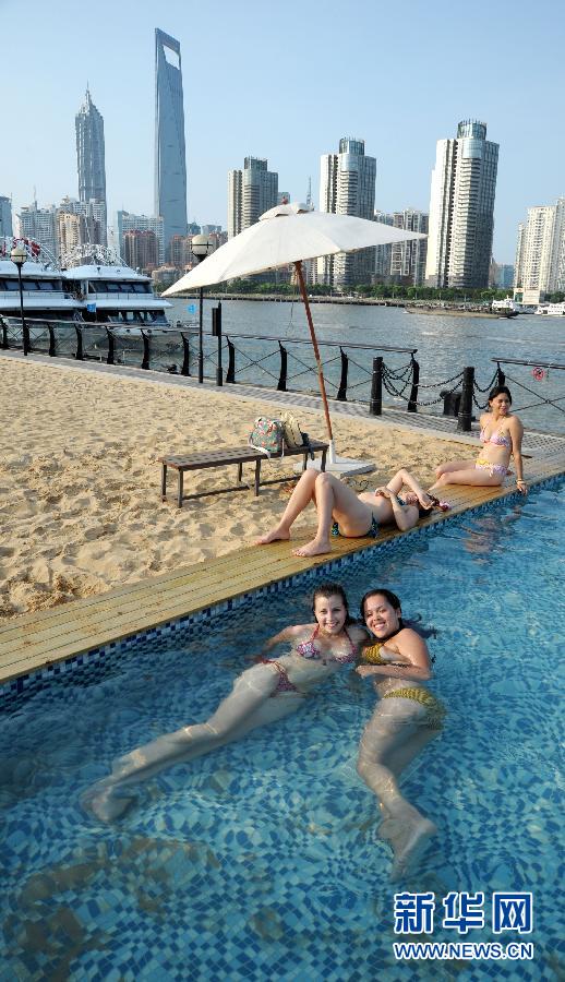 7月27日,游客在上海外灘“沙灘泳池”游泳避暑!吧碁┯境亍蔽挥谀贤鉃├洗a頭人造沙灘內(nèi),游客可以在此戲沙、游泳,同時享受浦江兩岸美景。