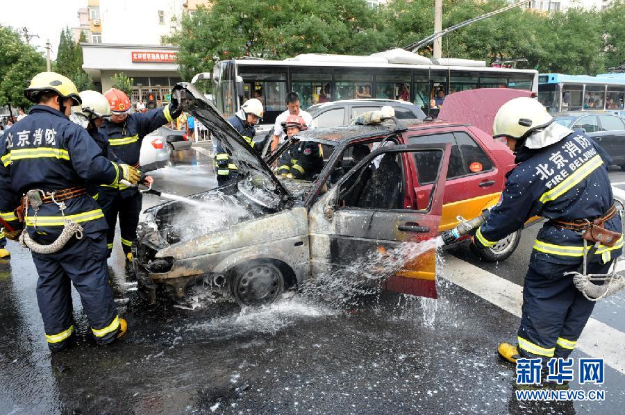8月2日,在北京市東城區(qū)安外大街,聞訊趕來的消防人員向自燃車輛噴水滅火! ‘(dāng)日,在北京市東城區(qū)安外大街,一輛出租車在行駛中自燃,沒有造成人員傷亡。 新華社發(fā)(胡慶明 攝)