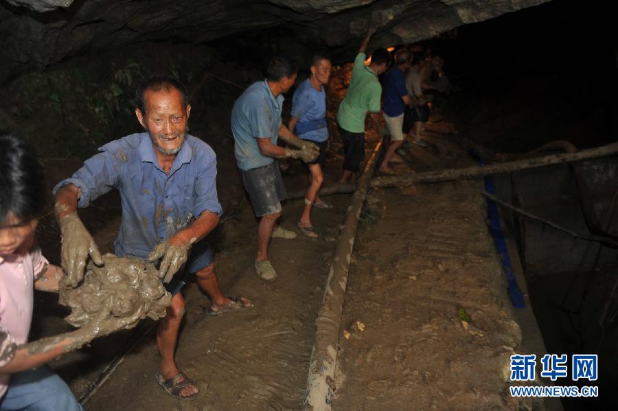 8月2日,在貴州石阡縣花橋鎮(zhèn)北坪村,當(dāng)?shù)氐狞h員自發(fā)組織“黨員抗旱救災(zāi)突擊隊(duì)”,對(duì)一處有水源的涵洞進(jìn)行清淤,準(zhǔn)備利用涵洞蓄水,開展生產(chǎn)自救。新華社記者 歐東衢 攝
