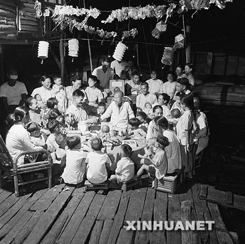 這是20世紀50年代,81歲的老漁民郭汝一家四代同堂共55人在中秋節(jié)夜大團聚,歡度佳節(jié)(資料照片)。 新華社發(fā)