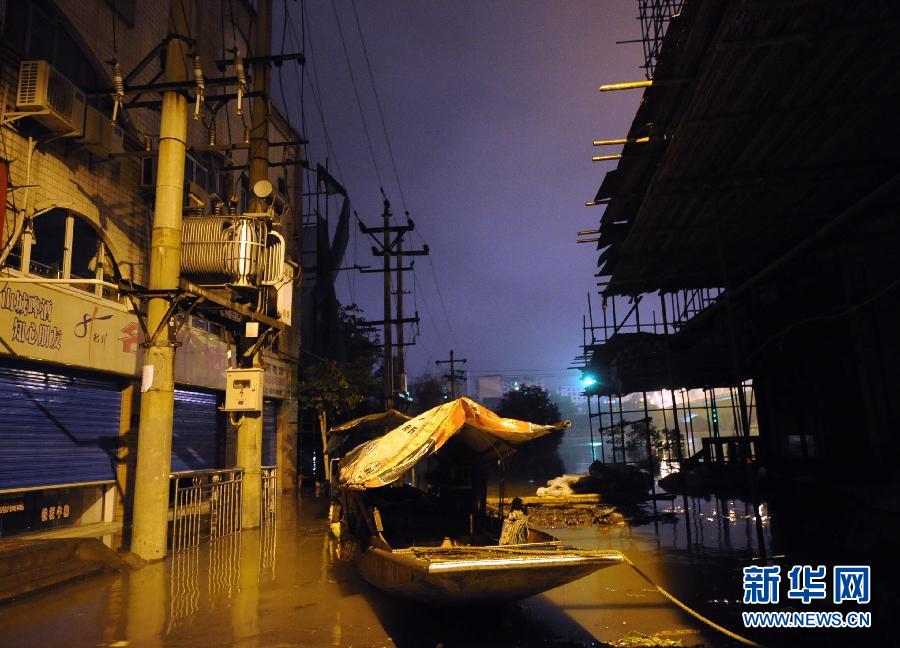 新華社照片 重慶 2011年9月19日 重慶合川區(qū)城區(qū)被洪水襲擊 9月19日,一只小船停在合川區(qū)街頭。當天,受嘉陵江、涪江、渠江上游連降暴雨的影響,重慶市合川區(qū)沿江街道被洪水襲擊,據水文部門預報,嘉陵江東津沱水文站將于9月20日8時迎來洪峰水位213m,超保證水位6.07米。截至9月19日11時,嘉陵江東津沱水位206.15米。目前水位仍在繼續(xù)上漲,已有8.3萬群眾被轉移,目前暫無人員傷亡。新華社記者 周衡義 攝