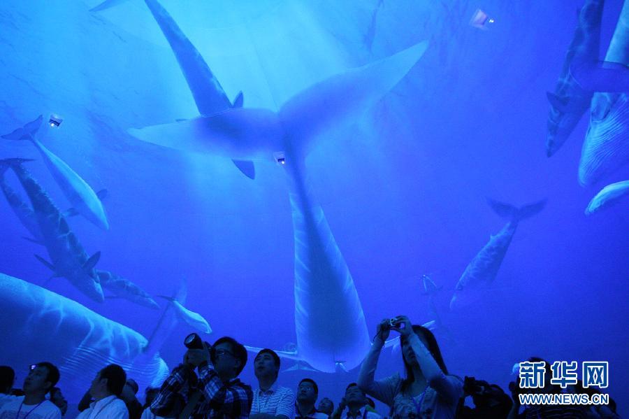 9月22日,游人在煙臺海昌天幕影院觀看360°全息天幕電影。當(dāng)日,一部以深海探險為主題的360°全息天幕電影在山東省煙臺市海昌天幕影院正式上映。該電影通過三維仿真技術(shù),結(jié)合LED燈光點陣和數(shù)字全息音響系統(tǒng),為觀眾展示了一個360°全景的立體“海洋世界”。新華社發(fā)(申吉忠 攝)