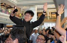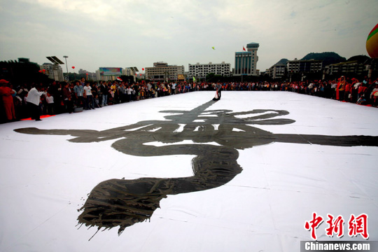 9月24日,書法家秦勝國在廣西桂林市甲天下廣場進行書法大字表演。秦勝國用拼接的宣紙現(xiàn)場寫出一個長50米、寬20米的巨型“舞”字,讓市民感受了書法藝術(shù)的獨特魅力。