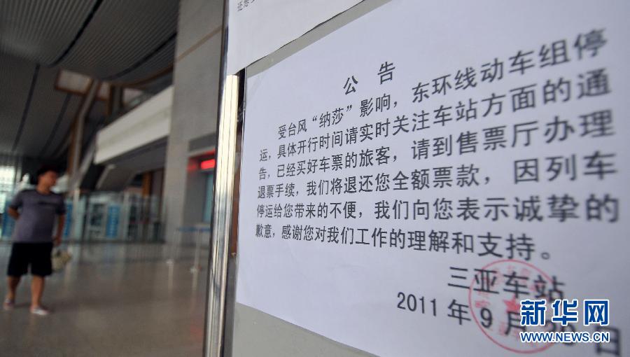 9月29日拍攝的三亞火車站的動(dòng)車停運(yùn)公告。今年第17號(hào)強(qiáng)臺(tái)風(fēng)“納沙”正一步步向海南沿海逼近。受其影響,9月29日上午8時(shí)開始,海南東環(huán)鐵路動(dòng)車全部停發(fā)。 新華社記者 侯建森 攝
