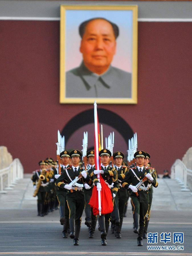 10月1日,國(guó)旗護(hù)衛(wèi)隊(duì)?wèi)?zhàn)士護(hù)送國(guó)旗走向升旗臺(tái)。當(dāng)日,來(lái)自全國(guó)各地的十二萬(wàn)余名群眾匯聚北京天安門(mén)廣場(chǎng),觀看隆重的升旗儀式,慶祝中華人民共和國(guó)成立62周年。新華社記者 羅曉光 攝