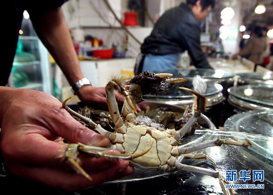 10月17日,上海市江蘇路一個市場的攤主展示一只大閘蟹。吃蟹的季節(jié)才剛剛開始,蟹券銷售卻早憑借互聯(lián)網,賣起了“期貨”。網友反映,“有券無蟹”、缺斤短兩甚至“人去樓空”的事,一再發(fā)生。新華社“中國網事”記者調查發(fā)現(xiàn),在送禮經濟的“發(fā)酵”催熱下,由于“每個環(huán)節(jié)都有錢賺”,蟹券這類預付“票證”才大行其道,亂象紛飛。專家建議,針對預付“票證”風險高的現(xiàn)狀,應盡快加強監(jiān)管。新華社記者 陳飛 攝