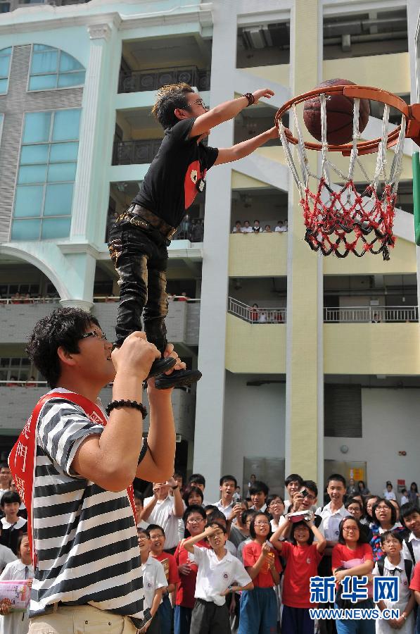 10月18日,張歡(下)、徐國(guó)元(上)在活動(dòng)中表演扣籃。當(dāng)日,身高2.38米、來(lái)自山東省的巨人張歡和身高1.02米、來(lái)自江蘇省的袖珍人徐國(guó)元亮相澳門(mén)培正中學(xué),為大家展示籃球技術(shù),并與學(xué)生們互動(dòng)交流。新華社記者 張金加 攝