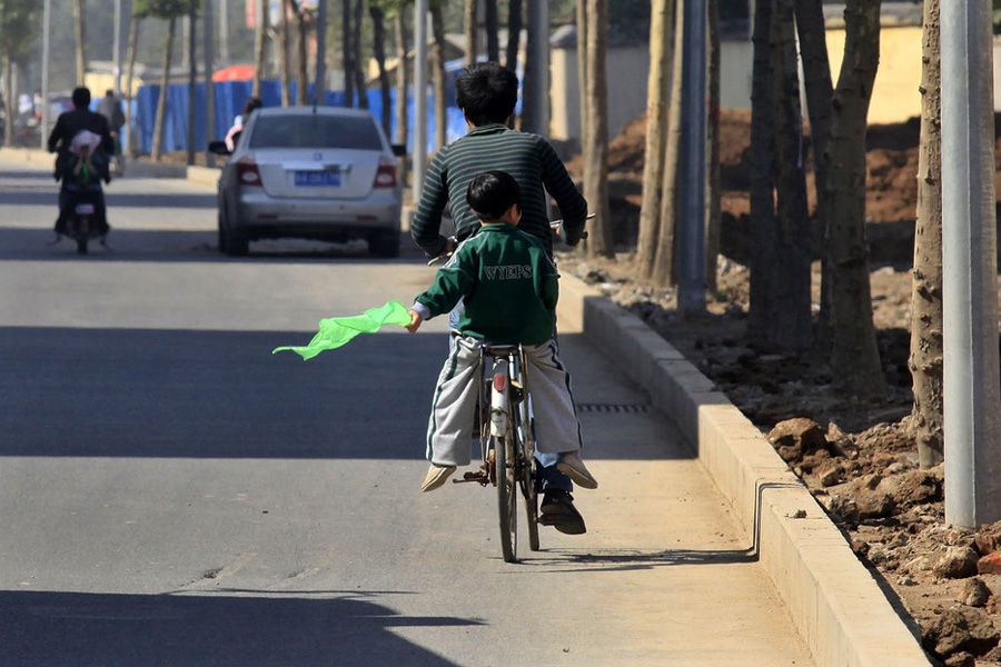 據(jù)介紹,學(xué)校委托制作紅領(lǐng)巾的廠家,設(shè)計(jì)了同樣大小的綠領(lǐng)巾,10月14日發(fā)放給沒有入隊(duì)的學(xué)生。學(xué)校九十多名一年級(jí)學(xué)生中,約有一半人都佩戴綠領(lǐng)巾。圖為一個(gè)孩子坐上家人的自行車,便將綠領(lǐng)巾摘下。