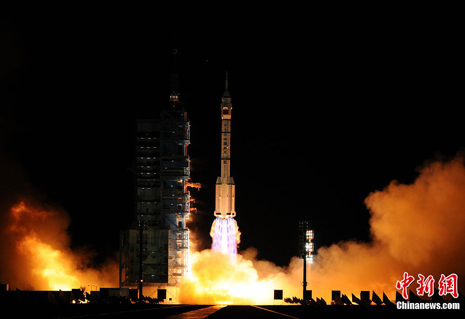 11月1日5時(shí)58分07秒,中國“長征二號(hào)F”遙八運(yùn)載火箭在酒泉衛(wèi)星發(fā)射中心載人航天發(fā)射場點(diǎn)火起飛,將“神舟八號(hào)”飛船發(fā)射升空。孫自法 攝