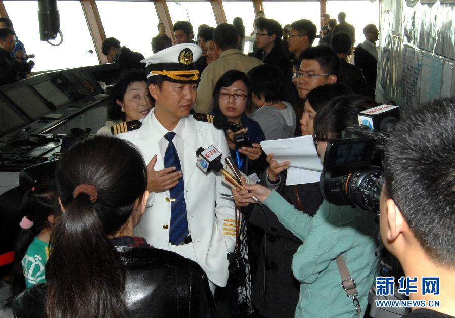 11月1日,“雪龍?zhí)枴蹦蠘O科考船船長沈權(quán)在駕駛艙內(nèi)接受媒體采訪。當(dāng)日,南極科考船“雪龍?zhí)枴痹谔旖蜞]輪母港對公眾開放,千余名對極地科考感興趣的市民和中小學(xué)生登上“雪龍?zhí)枴保欢闷滹L(fēng)采。據(jù)了解,“雪龍?zhí)枴痹谔旖蚨虝和A艉,將?1月3日從天津郵輪母港出發(fā),前往南極執(zhí)行中國第28次南極科學(xué)考察任務(wù),本次科考航程將達(dá)31000海里,計劃于2012年4月上旬返回上海。新華社記者 張超群 攝