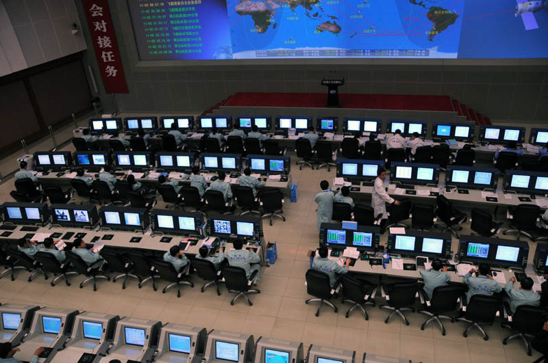 北京飛控中心指揮大廳內(nèi),工作人員緊張忙碌著,為交會對接進行最后的準備工作。圖片來源:新華網(wǎng)