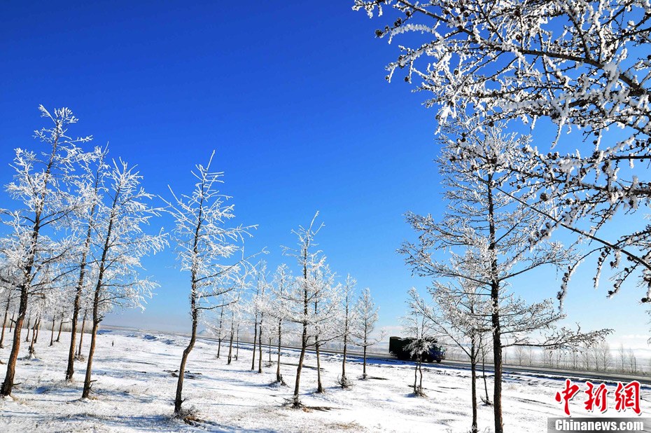 11月5日,內(nèi)蒙古牙克石市出現(xiàn)霧凇美景。11月2-3日,內(nèi)蒙古大部地區(qū)迎來入冬以來的第一場大范圍降雨或雨夾雪天氣。由于連續(xù)降溫,牙克石市提前迎來霧凇景觀。中新社發(fā) 余昌軍 攝 圖片來源:CNSPHOTO
