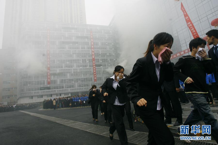 11月7日,在湖北武漢,人們?cè)谶M(jìn)行逃生救援綜合演習(xí)。