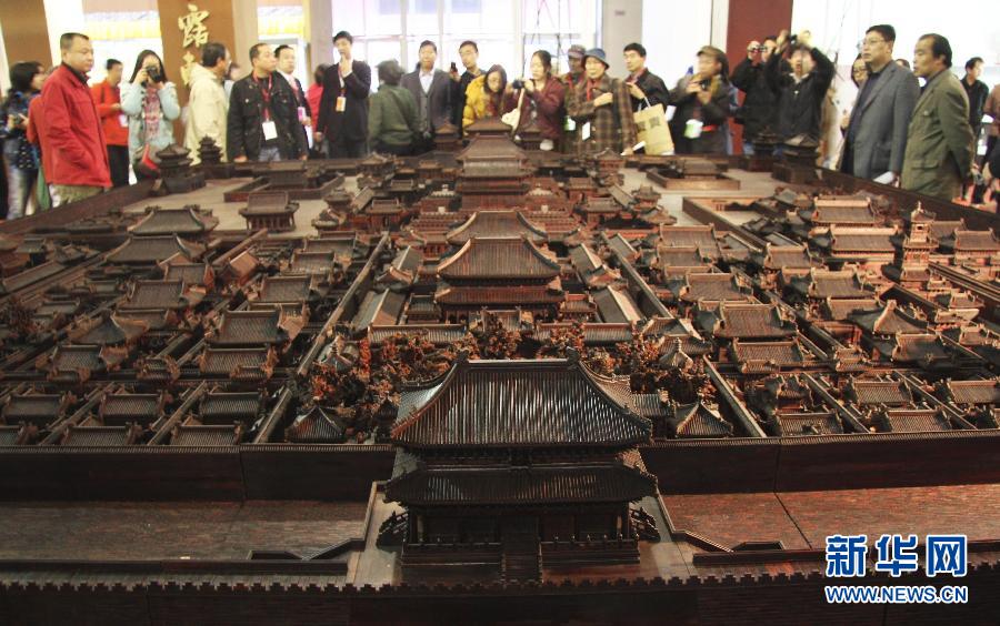 11月10日,在第六屆北京文博會主會場中國國際展覽中心展廳,觀眾欣賞大型紫檀木雕——“紫檀故宮”。第六屆中國北京國際文化創(chuàng)意產(chǎn)業(yè)博覽會11月9日起拉開帷幕。本屆文博會以“文化融合科技創(chuàng)新驅(qū)動發(fā)展”為主題,將舉辦展覽展示、論壇峰會、推介交易、創(chuàng)新創(chuàng)意等6大系列百余場活動。新華社發(fā)(傅新春 攝)