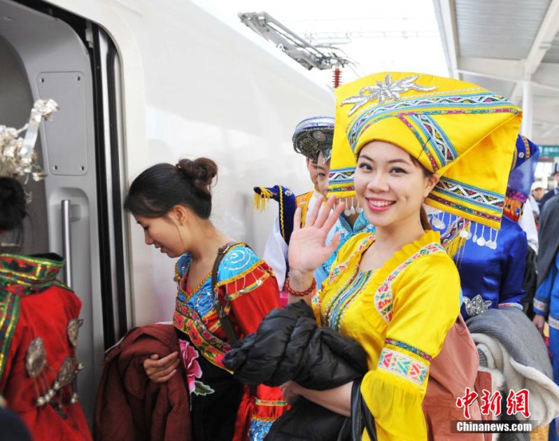 12月30日,廣西壯族自治區(qū)首府南寧市成為中國(guó)第一個(gè)開(kāi)通高鐵的自治區(qū)首府。當(dāng)日,南寧至桂林、南寧至防城港開(kāi)行動(dòng)車組。廣西12個(gè)少數(shù)民族姑娘結(jié)伴體驗(yàn)高鐵。廣西區(qū)內(nèi)聚居著壯、漢、瑤、苗、侗等12個(gè)民族。中新社發(fā) 蔣雪林 攝
