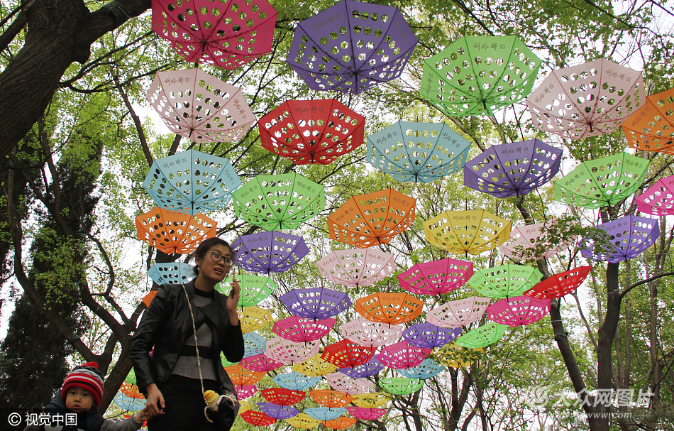 2017年4月11日,在山東濟(jì)南泉城公園景區(qū)內(nèi),近千把“七彩雨傘”懸掛在公園上空,扮靚公園,絢麗多彩的顏色自然招引眾多游客留步拍照。