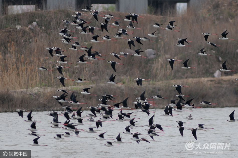 2017年4月16日,山東省青島市,進(jìn)入候鳥繁殖季節(jié),大批來自臺灣、福建沿海越冬的黑翅長腳鷸、反嘴鷸、大杓鷸等鷸類候鳥開始在膠州灣濕地安家筑巢,翩躚起舞的“鷸鳥季”拉開序幕。
