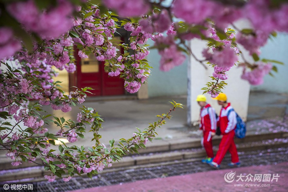2017年4月17日,濟南,一場春雨過后,東部濟鋼新村體育館內的櫻花林,櫻花花瓣落滿一地,粉紅色的花瓣浸染了綠色的草坪,市民花間行走,拍照留念。