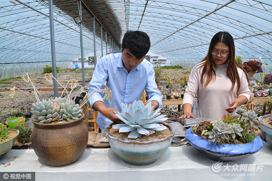 2017年4月20日,在山東省日照市莒縣陵陽(yáng)鎮(zhèn)借莊村一處多肉大棚里,張永振和王楓正在整理幾盆多肉植物。這對(duì)出生于1990年的小夫妻,2012年,他們從工作的上;氐嚼霞疑綎|,因?yàn)橄矚g多肉植物,于是就在自己家的地里,開始了自主創(chuàng)業(yè)的夢(mèng)想,經(jīng)過(guò)幾年的發(fā)展,目前已成為當(dāng)?shù)刈畲蟮亩嗳庵参锱l(fā)商!