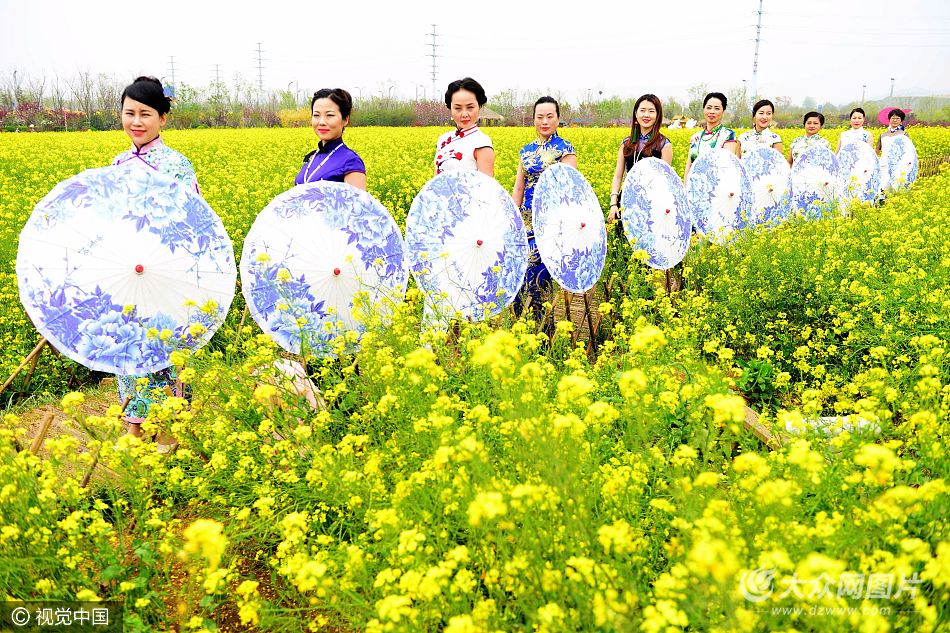 2017年4月21日,山東青島西海岸生態(tài)觀光園,旗袍愛好者在盛開的油菜花海中進(jìn)行旗袍走秀。