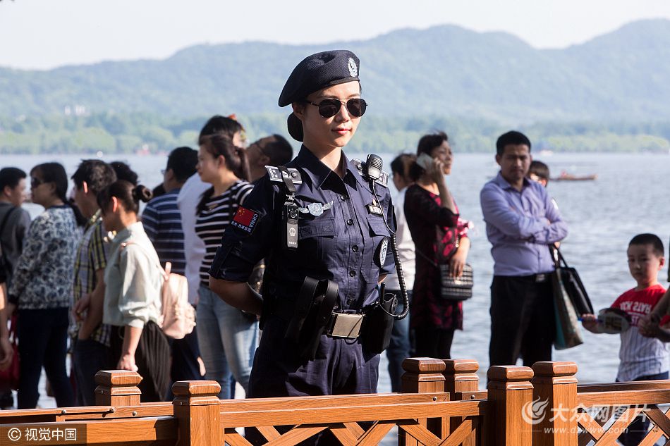2017年4月29日,杭州,清一色的貝雷帽、墨鏡、藍牙耳機、執(zhí)法記錄儀……身著統(tǒng)一制服的美女城管成為人海中的一道風(fēng)景。供圖:林安/視覺中國