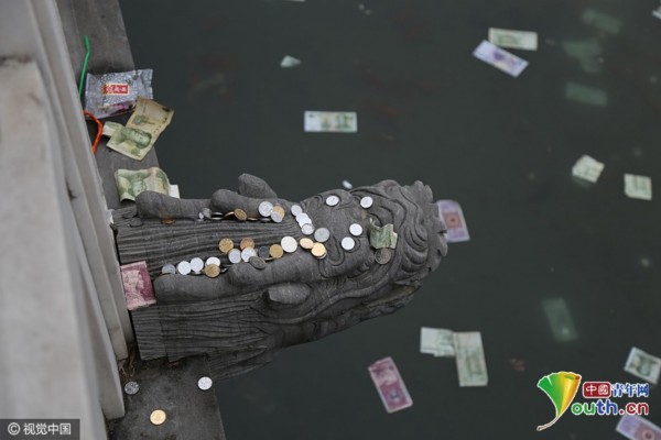 2017年1月28日,河南鄭州,鄭州文廟在大年初一正常開放,不少市民前來燒香請(qǐng)?jiān)福膹R門前的泮池(半月形水池)內(nèi)卻被扔滿了各類紙幣、硬幣,游客還在水池邊龍首形出水口上堆滿人民幣,有人調(diào)侃“水池里的金魚都驚呆了”。